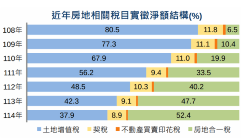 根據財政部統計,2019年以前土增稅為房地交易稅收最大宗來源,占逾8成;隨房地合一稅自2016年起實施,適用案件遞增及2021年2.0新制上路,其在房地相關交易稅收占比逐年上升,2024年起超越土增稅,2025年更達52.4%,顯示房地交易稅收結構已明顯轉變。