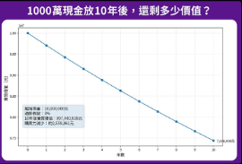 通膨最可怕的地方,不是一次性的價格跳升,而是它會在日常裡慢慢吃掉現金的價值。以3%通膨率作為情境試算,今日手上的1,000萬元現金,10年後的實質購買力將只剩下約744萬元。帳面數字或許沒有改變,但未來能換到的生活條件、資產規模與選擇空間,卻早已不同。當物價、薪資與資產價格都在往上墊高,唯有現金停在原地,這種無聲的縮水,正是許多人在大通膨時代下最真實的焦慮來源。