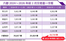 從市場面來看,六都2026年前2月建物買賣移轉棟數約2.87萬棟,年減約3.7%,相較前期動輒雙位數修正,量縮幅度已有明顯收斂。